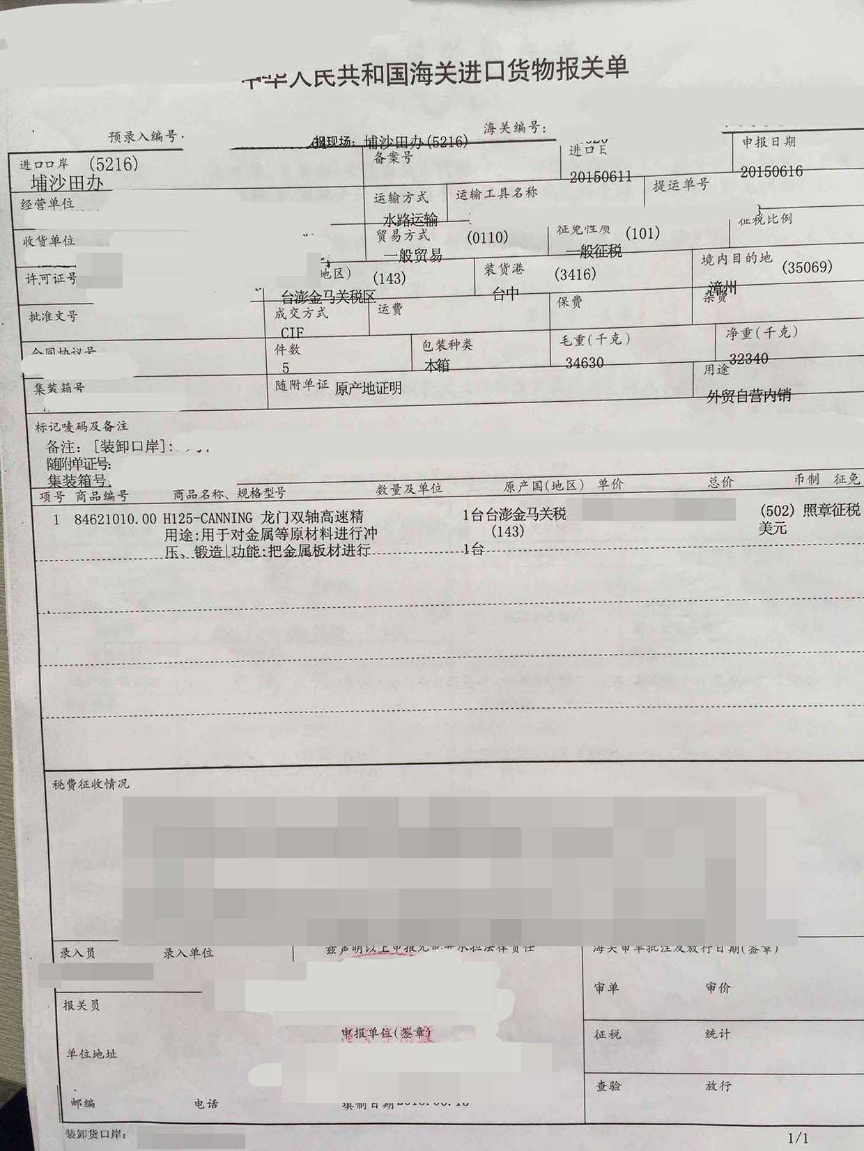 三、龍門雙軸高速精密沖床進口報關案例展示