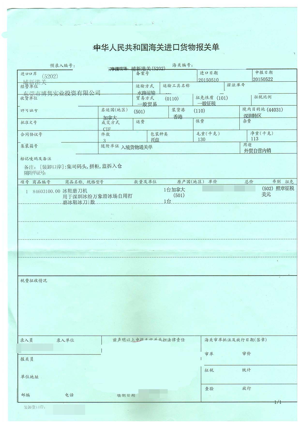 三、冰鞋磨刀機(jī)進(jìn)口報關(guān)案例展示