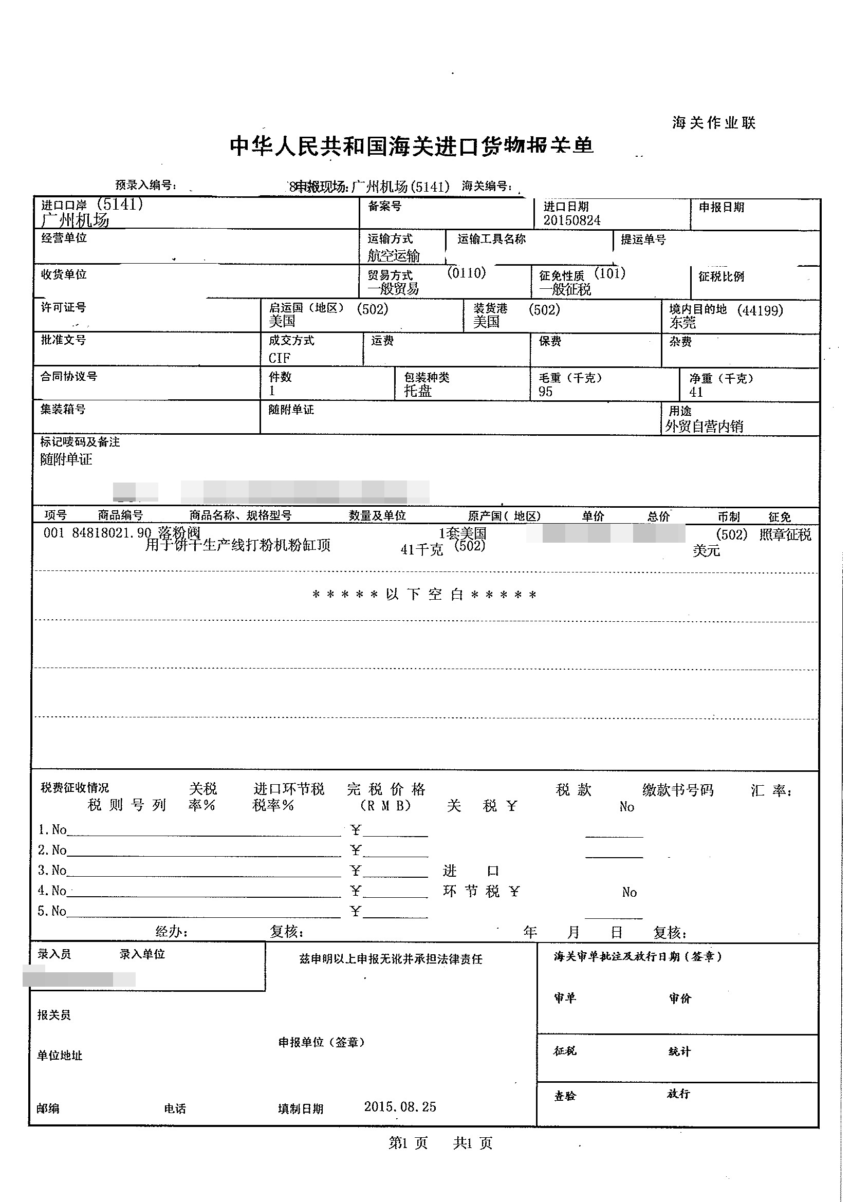 三、食品落粉閥進口報關案例展示