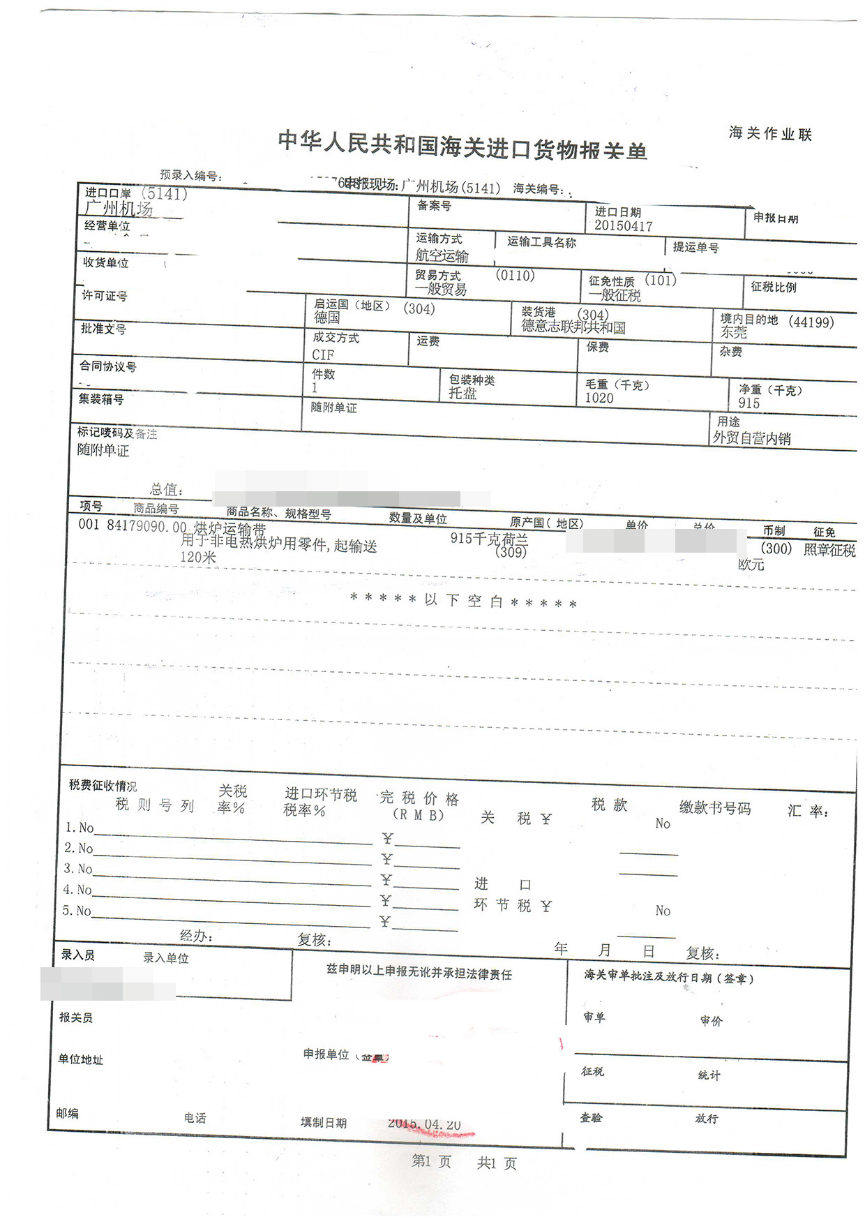 一、烘爐運輸帶進口報關(guān)手續(xù)資料